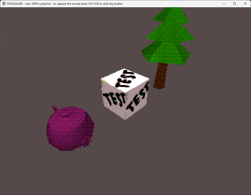 C | 19.03.2026 | DOS, requires 32bit extender, output to VGA mode 13h (256 colors), much faster triangle rasterization alg. |